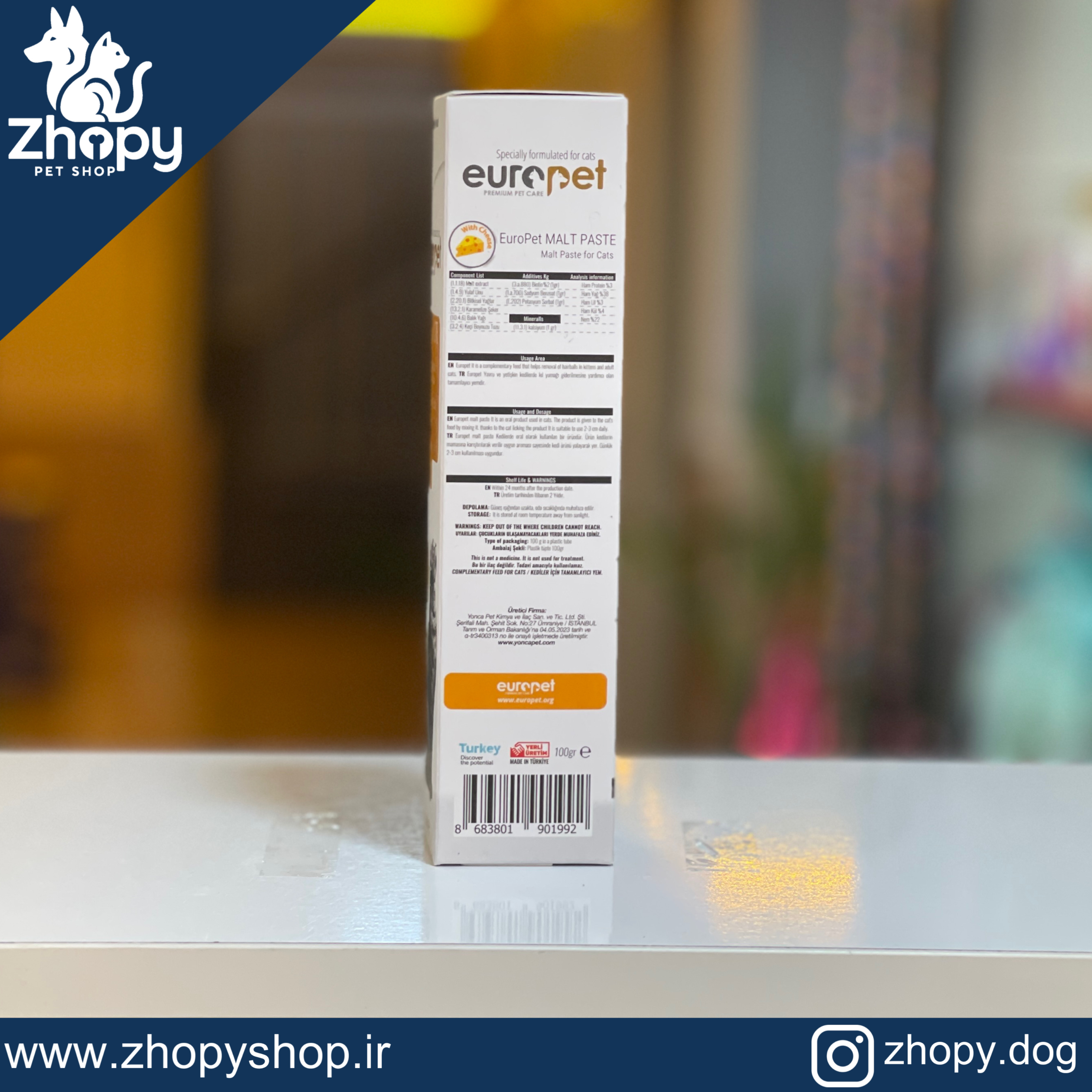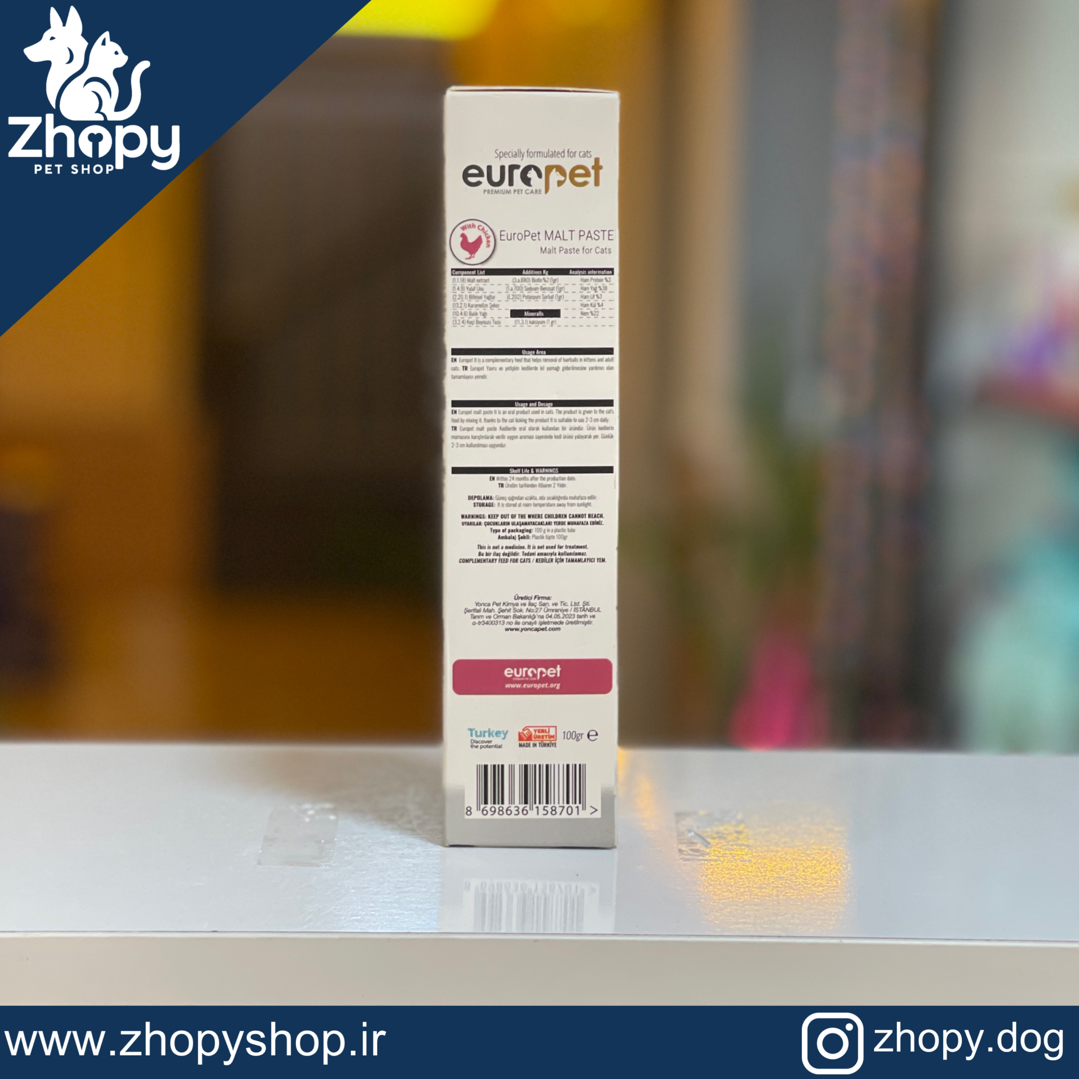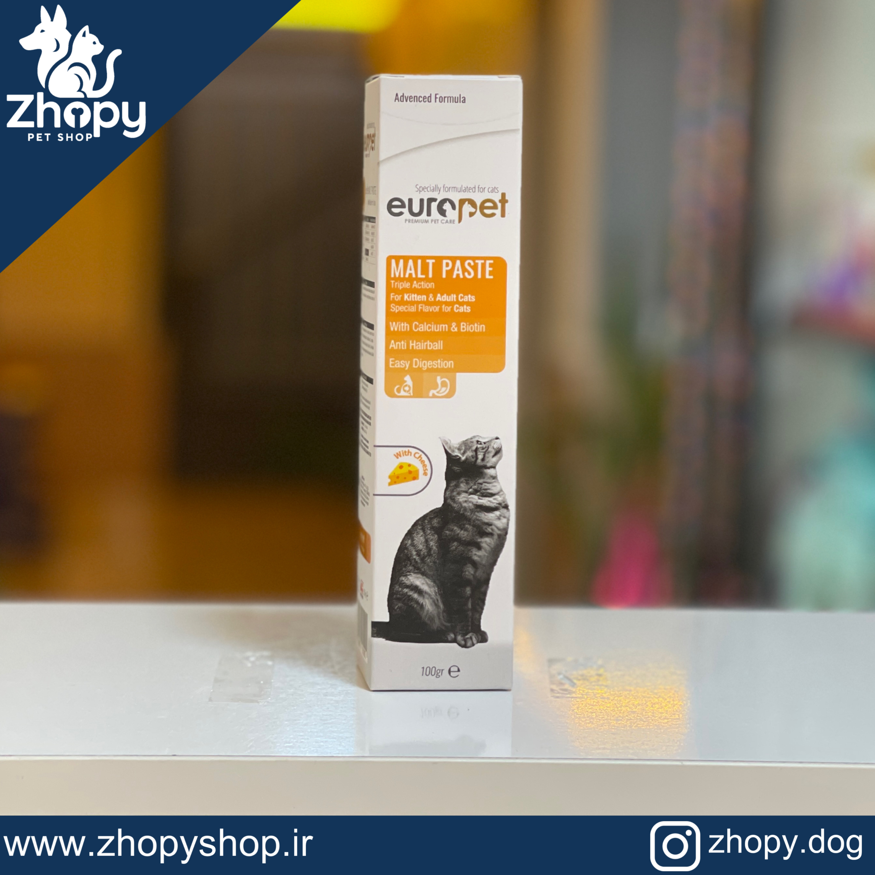 خمیر مالت یوروپت با طعم مرغ و طعم پنیر یک مکمل غذایی برای گربهها است که به دفع گلوله مویی کمک میکند این محصول حاوی بیوتین است که مراقب سلامت پوست و مو میباشد ن محصول دارای دو طعم مختلف مرغ و پنیر است که میتواند سلیقههای مختلف را به خود جذب کند.